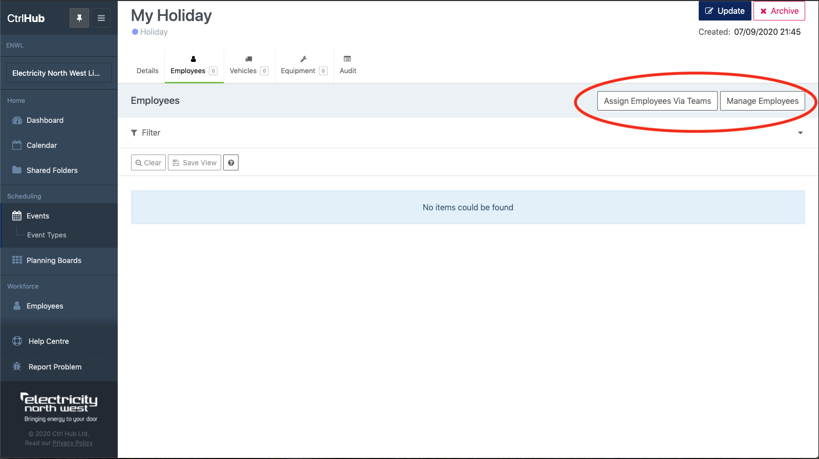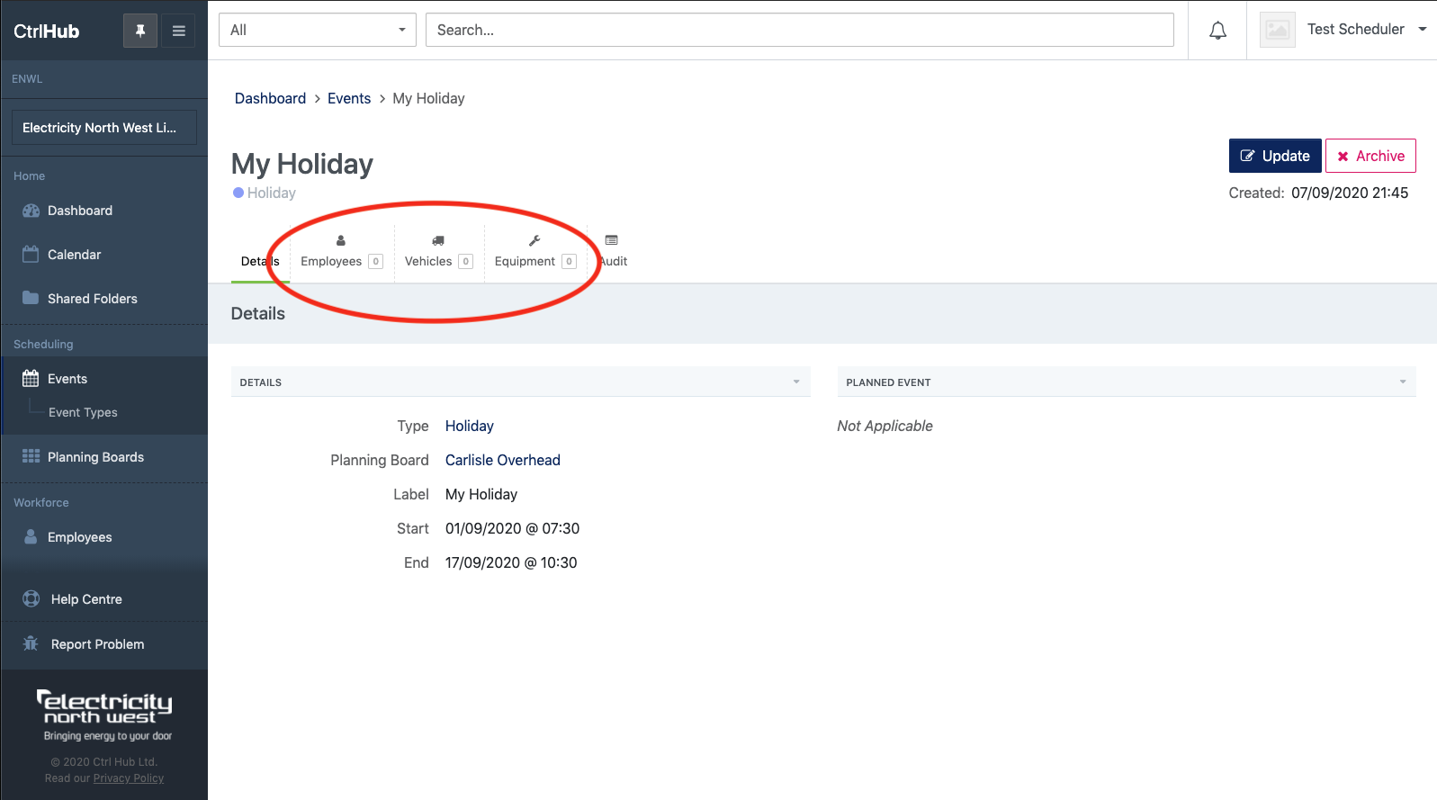 Resources (People, Vehicles/Plant, Equipment) can be assigned to events via the Event Detail Page.