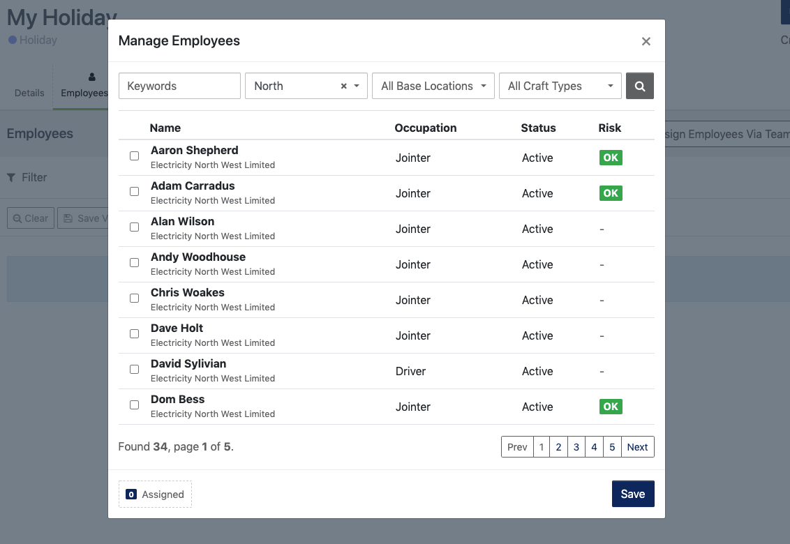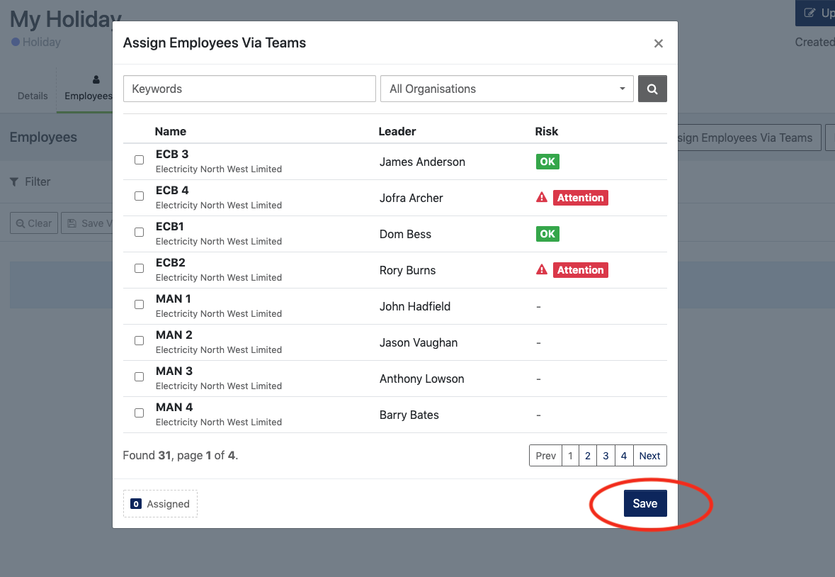 Simply check the box beside each team and click the "Save" button highlighted to assign employees.