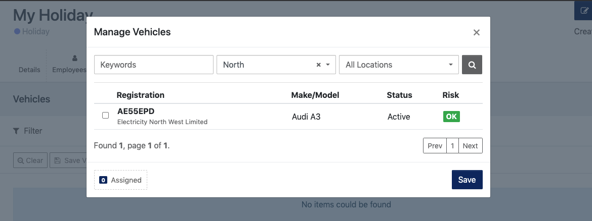 Clicking "Manage Vehicles" will allow vehicles to be located and assigned - both vehicles and equipment can be searched by:-