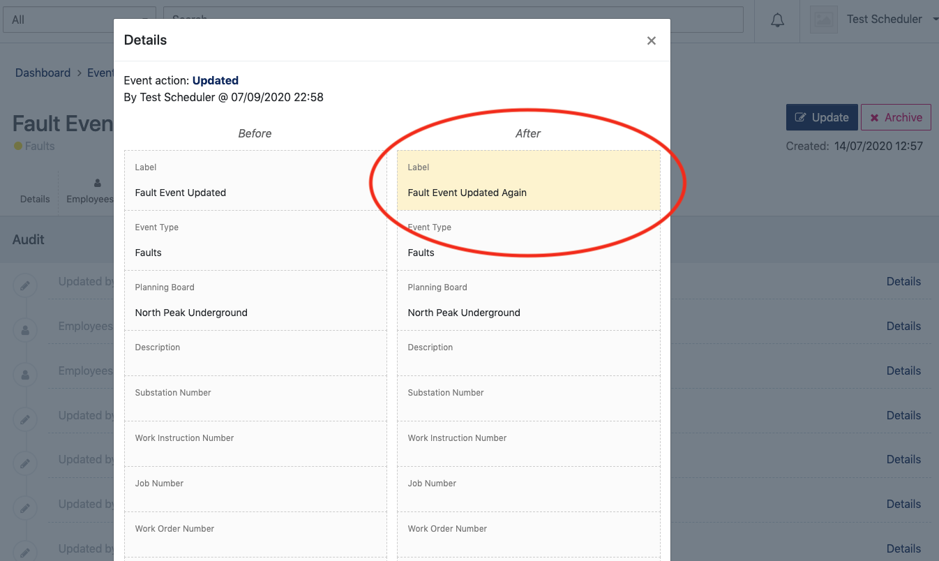 Clicking on Details beside an Audit Entry will show you the changes made during that particular Audit Entry in a diff view - you can see the data held about the Event before the change and after the change with the portions that were updated highlighted for easy reference: