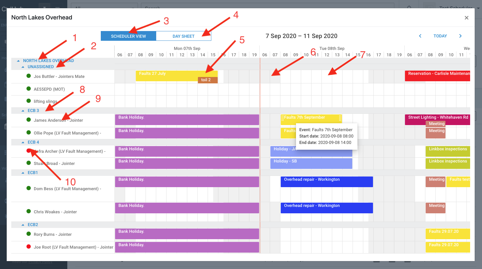 The legend below shows each feature of the planning board view according to the numbered sections in the image above.