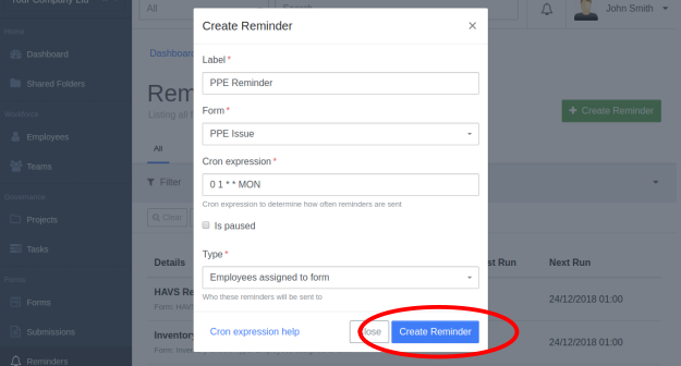 The example expression would send a reminder at 9:30am on the 10th of every month.