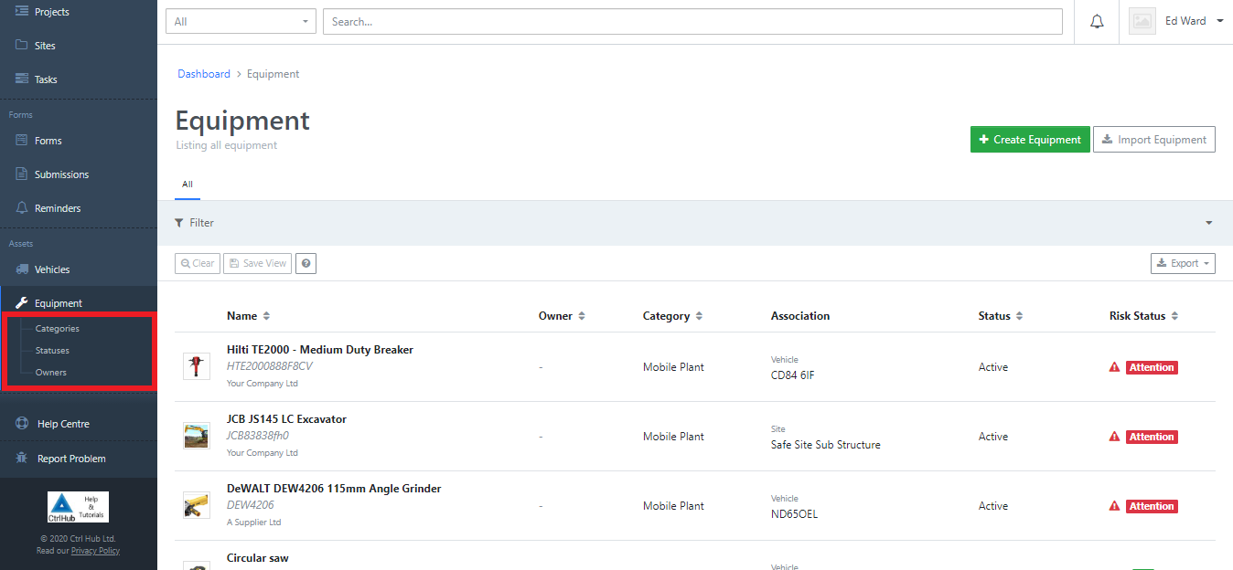 Equipment categories, statuses & owners can be managed via their respective links in the main navigation