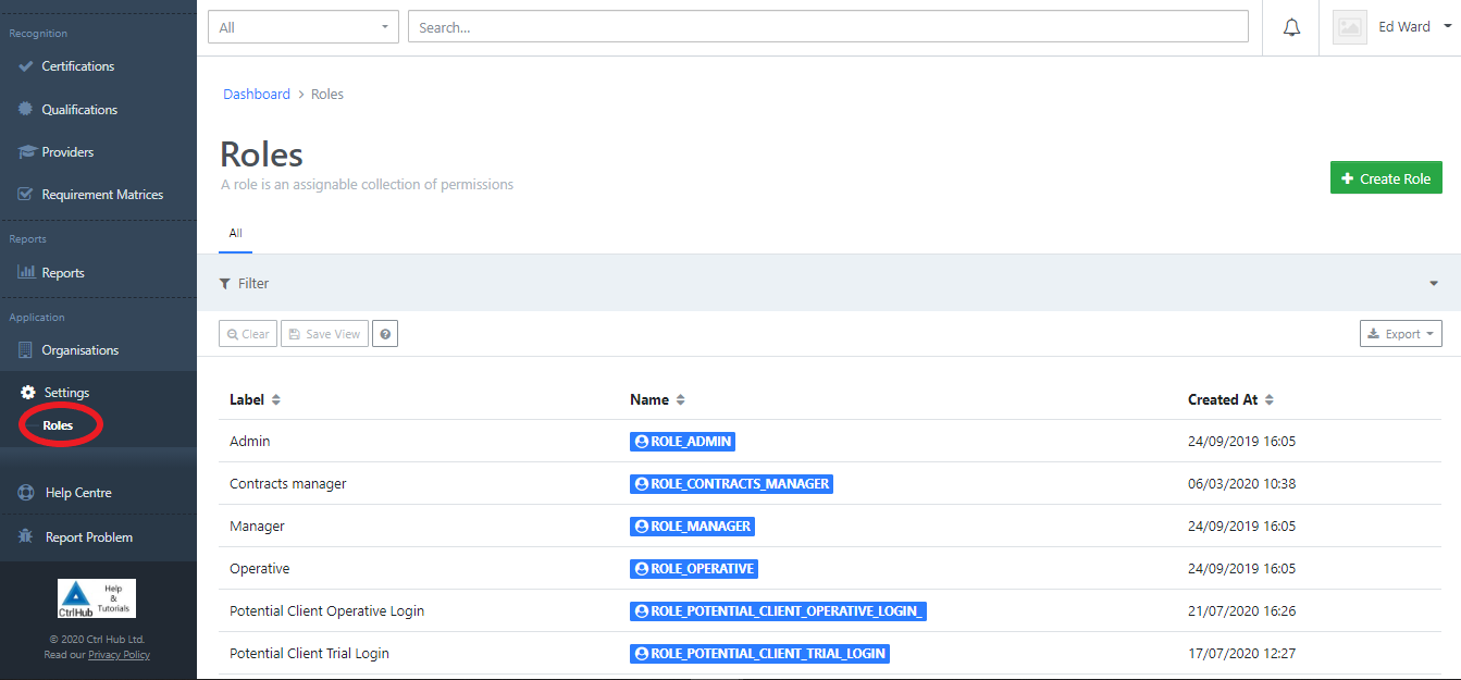 You can access the roles listing by clicking the Settings: Roles link in the navigation: