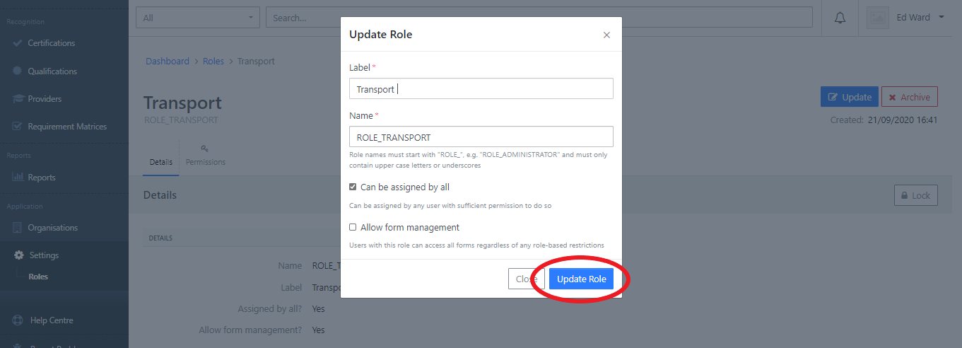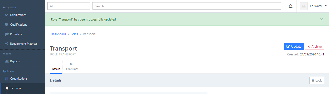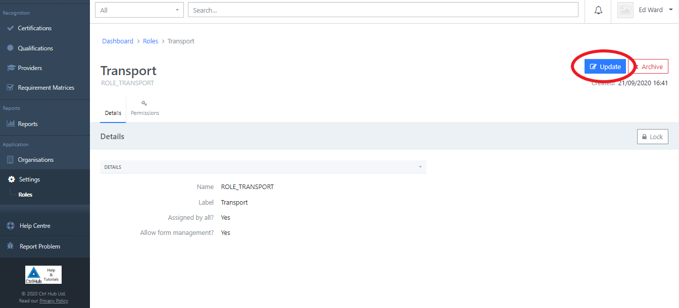 Updating a Role When viewing the role you need to update, click the Update button: You can then make any required changes and click the Update Role button: You will then see a success message and the updated role information