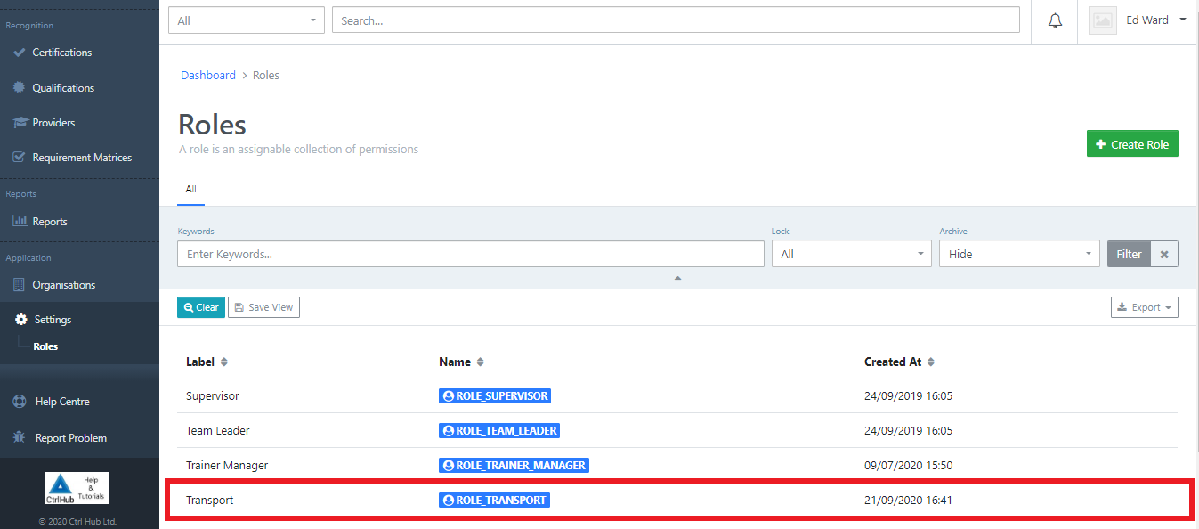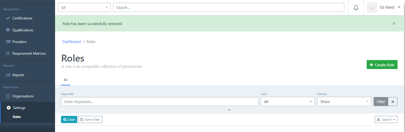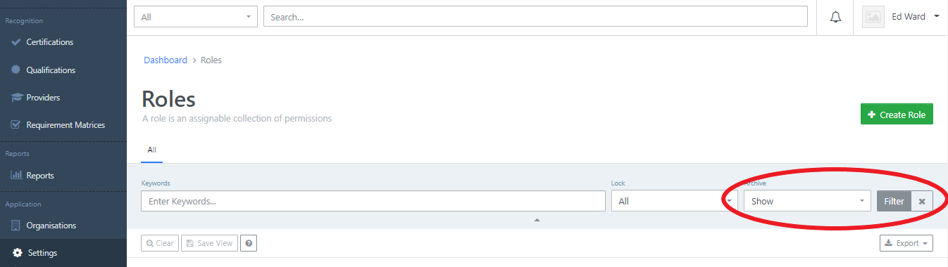 To restore a role use the Filter to list roles that have been archived. Ensure that you select “Show” from the “Archive” dropdown then press the Filter button: