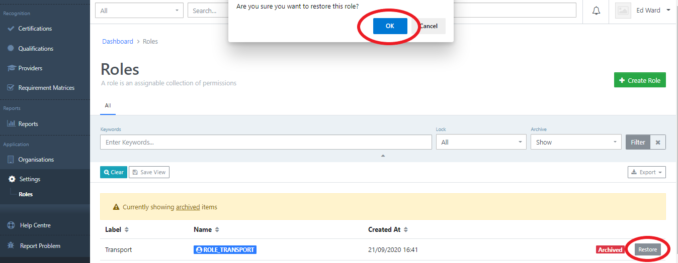 To restore a role, click the Restore button then confirm by clicking the OK button: