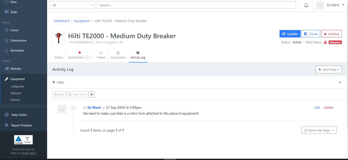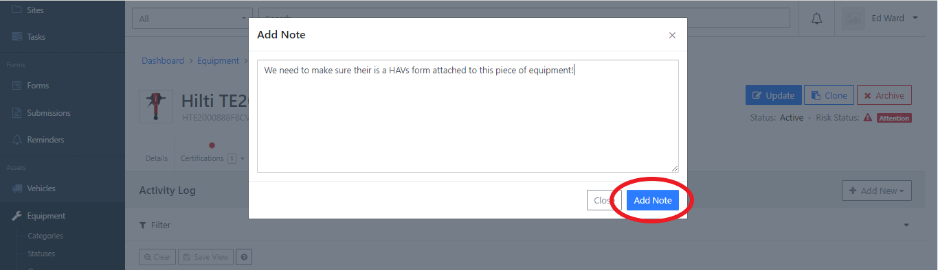To add a new note, sketch, file or to call to any entity with an activity log, click the Add New in the dropdown menu and select the option you wish to add. We will use a piece of Equipment's activity log and add a Note as an example: