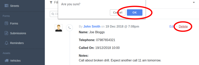 Deleting an Activity Deleting works in the same way for all activity types. Simply click the Delete button, then click OK to confirm: You will then see a success message but no longer see the deleted activity in the activity log: