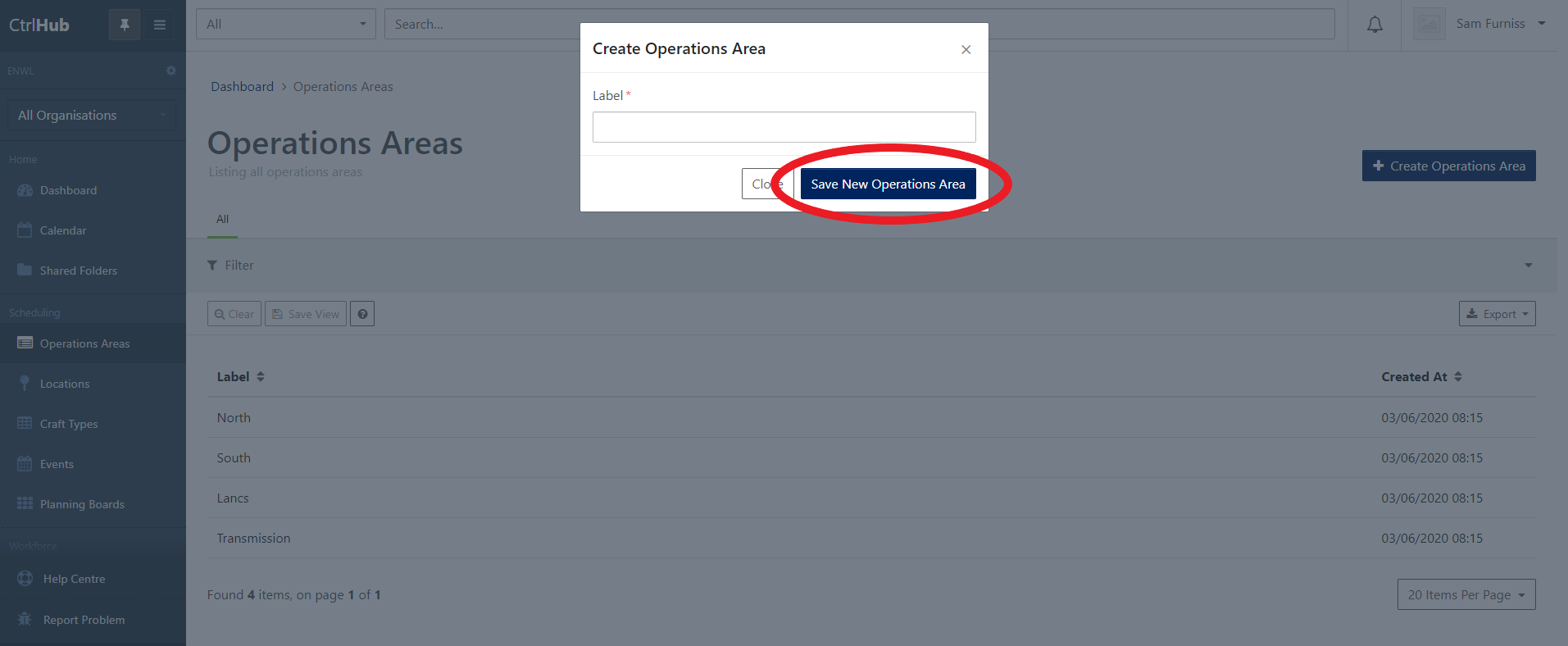 Enter the new Operation Area name in the Label box and select Save New Operations Area