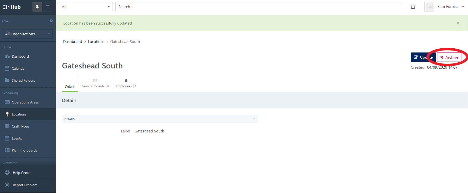 You will now be back on the Locations listing page with a success message. The archived Location will no longer be listed: