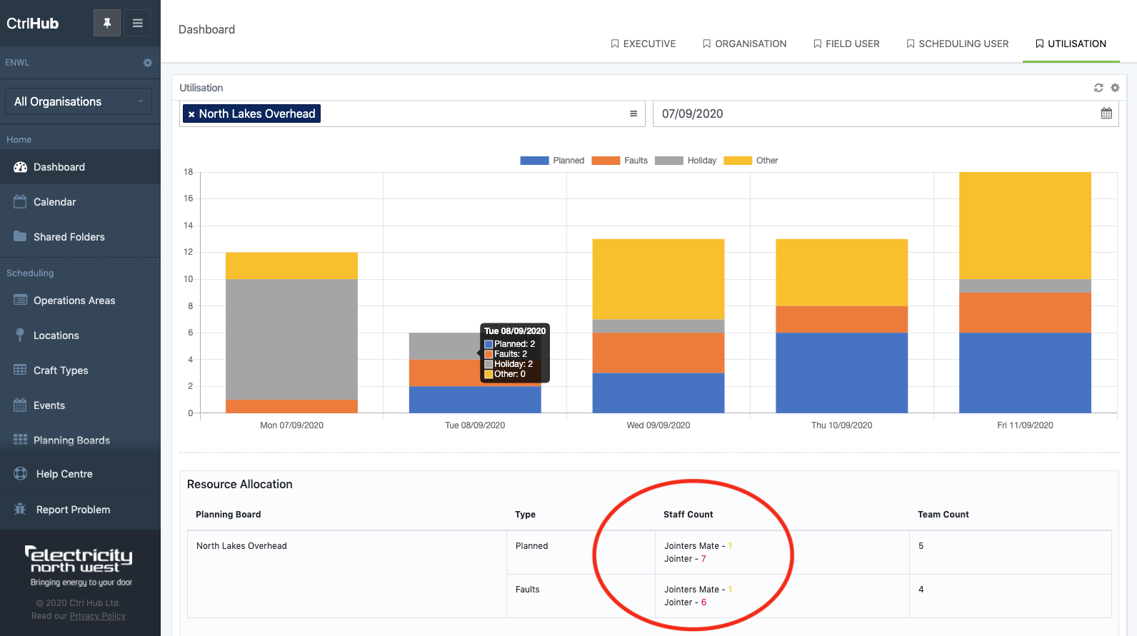 This will result in a utilisation dashboard as shown below - you can see the KPI's driving the Staff Counts against each Occupation for Planned and Faults.