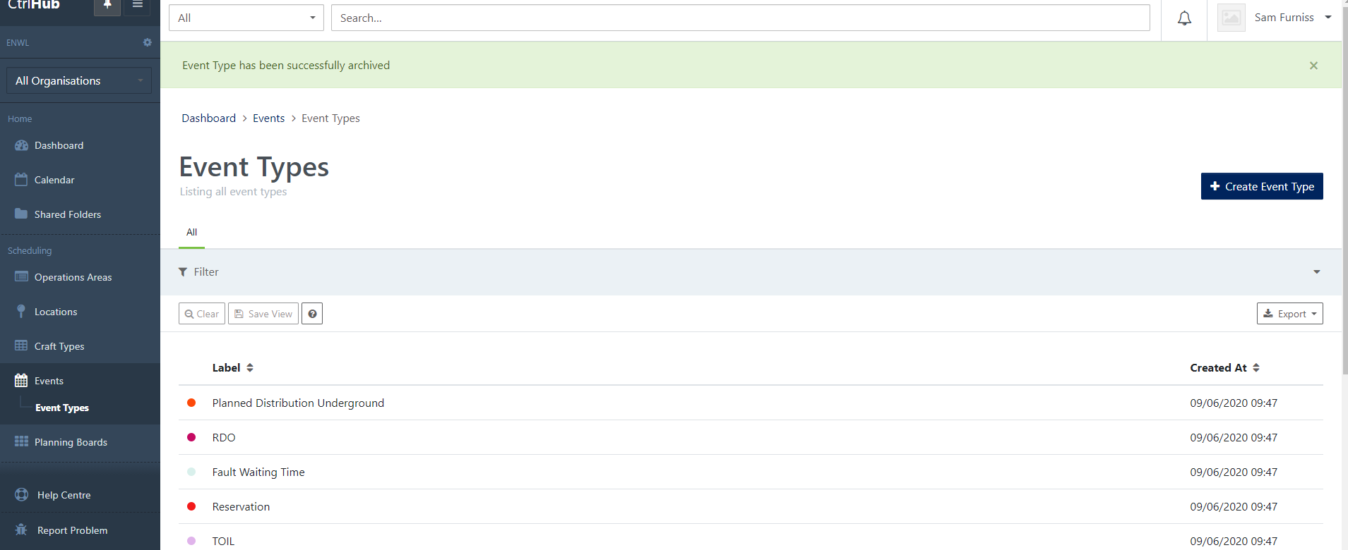 You should now be back on the Event Type listing page with a success message. The archived Event Type should no longer be listed: